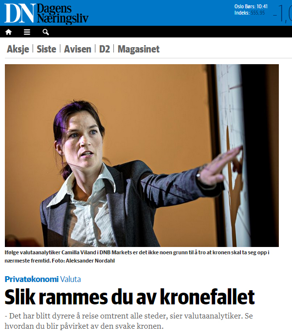 Valutaanalytiker Camilla Viland i DNB Markets sier til Dagens Næringsliv at hun ikke tror kronen vil styrke seg med det første.